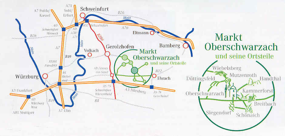 Der Markt Oberschwarzach liegt mit seinen acht Ortsteilen im südlichen Landkreis Schweinfurt.